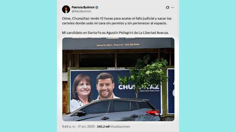 Según confirmó la propia ministra en su cuenta personal de X, la Justicia falló a favor de la demanda del partido libertario. “Oíme, Chumpitaz: tenés 12 horas para acatar el fallo judicial y sacar los carteles donde usás mi cara sin permiso y sin pertenecer al espacio”, instó la funcionaria en su publicación. De la misma manera, la candidata a senadora nacional por la Ciudad de Buenos Aires aclaró: “Mi candidato en Santa Fe es Agustín Pellegrini de La Libertad Avanza”.