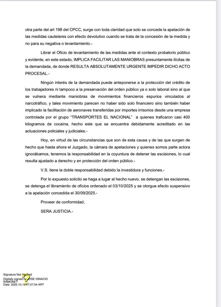 En la causa laboral “Yedro, Franco Marcelo y otros c/ Lácteos Vidal S.A. s/Incidente” (Expte. N° 30061/2022), el Juzgado Nacional del Trabajo N°69, a cargo del juez Ignacio Ramonet, había ordenado un embargo preventivo por 168 millones de pesos sobre los fondos de la láctea pocos días antes de la reunión con Bullrich.