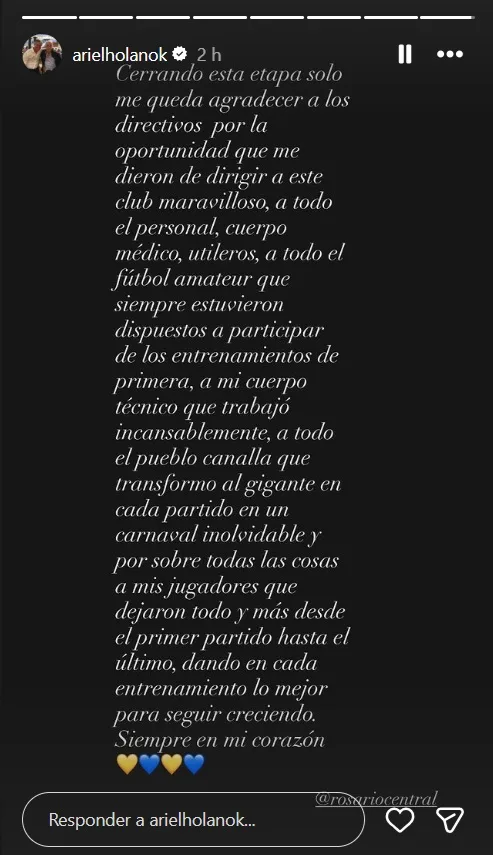 Tras 24 horas de conocerse que Rosario Central no le renovará el contrato a Ariel Holan, el entrenador decidió subir una historia en su cuenta de Instagram para despedirse del «mundo Central». El profesor y ahora ex entrenador canalla prefirió utilizar una red social en lugar de dar alguna entrevista. Es probable que más adelante acceda a charlar con algún medio y hablar sobre sus sensaciones tras la no continuidad en el banco auriazul, pero por ahora se inclinó por un breve escrito en su cuenta @arielholanok.