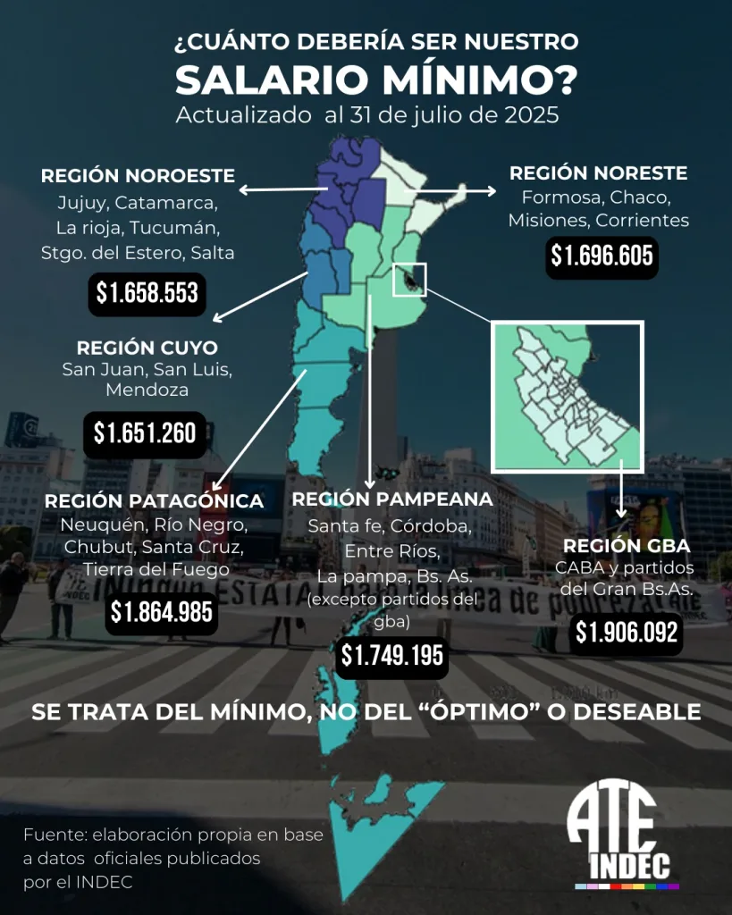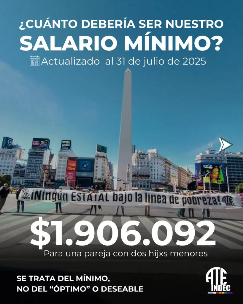 La junta interna de ATE-INDEC difundió hoy su informe mensual de evolución del salario mínimo según la canasta de bienes y servicios que establecen para lo que consideran un ingreso mínimo para una familia trabajadora. Es el que permite, además de satisfacer las necesidades básicas, poder abordar otros gastos destinados al ocio y el esparcimiento que hagan de la vida algo que valga la pena disfrutar, al menos, mínimamente.
