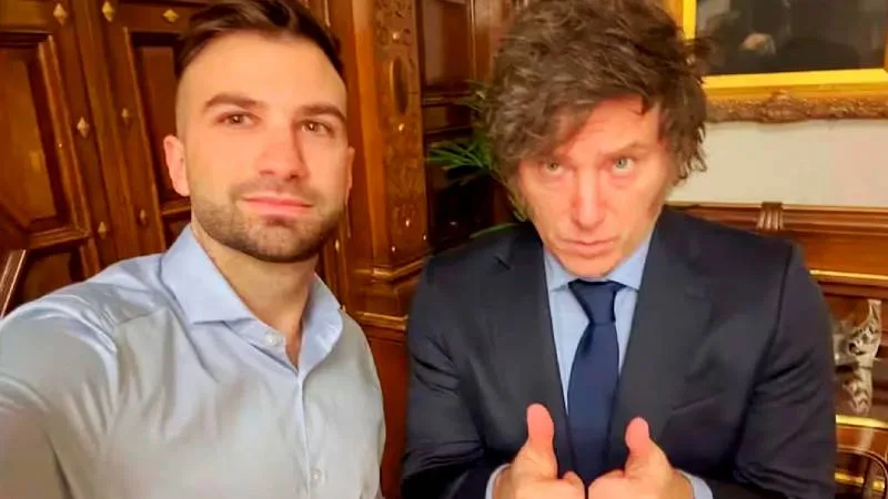 Mauricio Novelli tiene veintinueve años y desde hace por lo menos cinco, es empleador de Javier Milei. Cuando su empleado llegó a la presidencia, él estuvo en el búnker de campaña y se filmó celebrando: