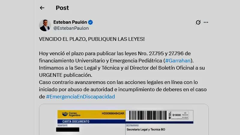 “VENCIDO EL PLAZO, PUBLIQUEN LAS LEYES! Hoy venció el plazo para publicar las leyes Nro. 27.795 y 27.796 de financiamiento Universitario y Emergencia Pediátrica (#Garrahan)”, reclamó.