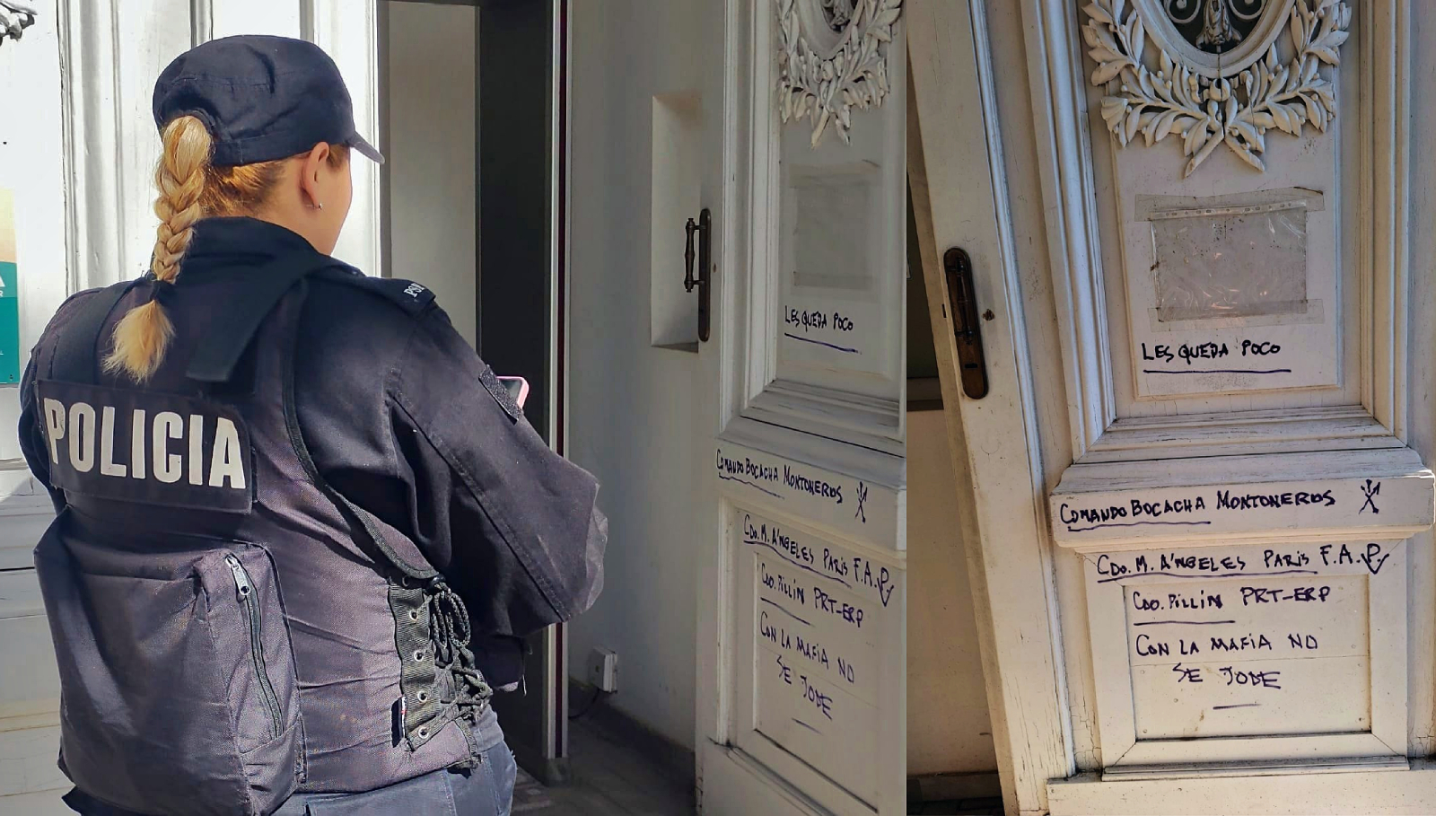 Rosario convulsionada tras el asesinato del líder de la barra canalla, Andrés «Pillín» Bracamonte, da para todo: incluso para que a un solitario hombre, en la madrugada de este martes, se le ocurriera escribir con fibrón en la puerta del Concejo Municipal inverosímiles nombres de supuestos grupos armados de bizarra mezcla: “Comando Bocacha Montoneros”, “Cdo. Ángeles Paris FAP”, “Cdo. Pillín PRT-ERP”, estampó en la abertura y agregó la clásica leyenda “Con la mafia no se jode”.