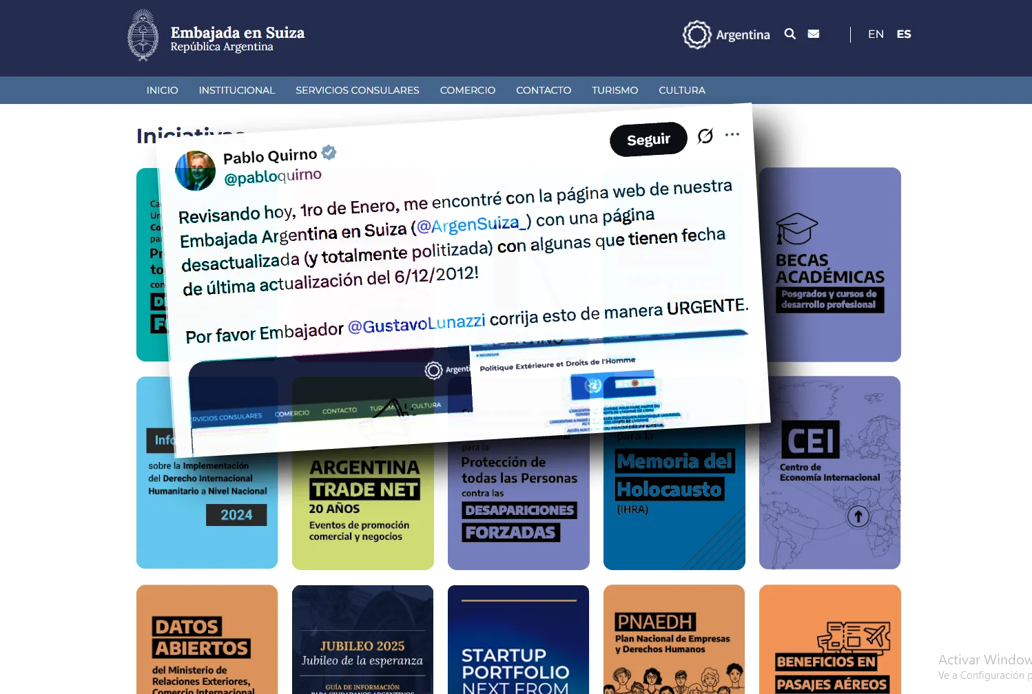 El ministro de Relaciones Exteriores, Pablo Quirno, reprendió este jueves por redes al embajador argentino en Suiza, Gustavo Lunazzi. El reto es por el estado del sitio web oficial de la representación diplomática, que permanecía sin actualizarse desde hacía más de una década. Y, sobre todo, porque hace amplia referencia a los derechos humanos, al derecho a la identidad y menciona a la presidenta de Abuelas de Plaza de Mayo, Estela de Carlotto.