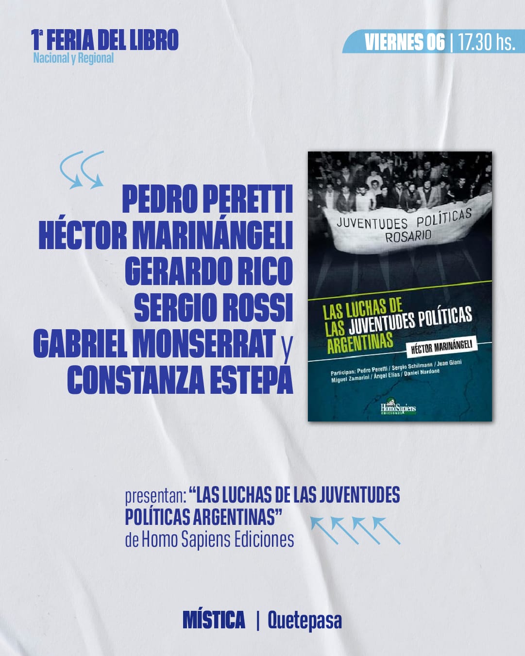 Este viernes desde las 17.30hs. En el marco de la 1’ Feria del Libro Nacional y Regional de la organización política “Que te pasa” (QTP) (Riccheri 340), Pedro Peretti, Héctor Marinángeli, Gerardo Rico, Sergio Rossi, Gabriel Monserrat y Constanza Estepa presentarán el libro “Las luchas de las juventudes políticas argentinas: juventudes políticas de Rosario”, con entrada libre y gratuita.
