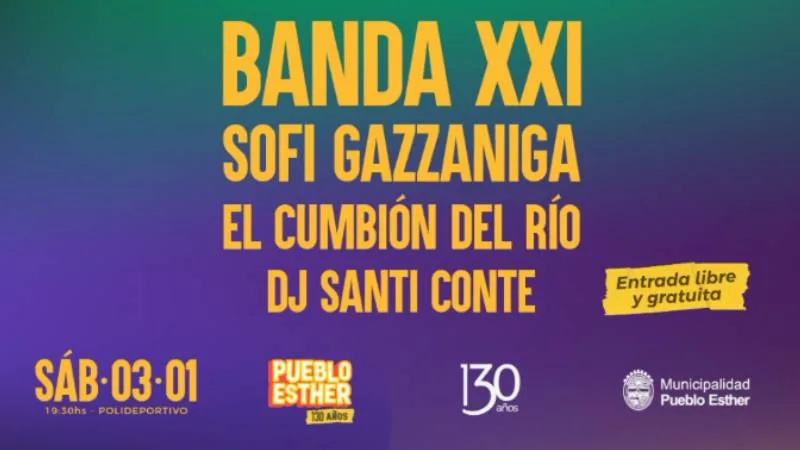 La Municipalidad de Pueblo Esther informa que el festival por el 130° aniversario de la ciudad, originalmente previsto para el sábado 29 de noviembre, se reprograma para el sábado 3 de enero de 2026, desde las 19.30 horas, en el Polideportivo Municipal (J. D. Perón 1680). La entrada será libre y gratuita