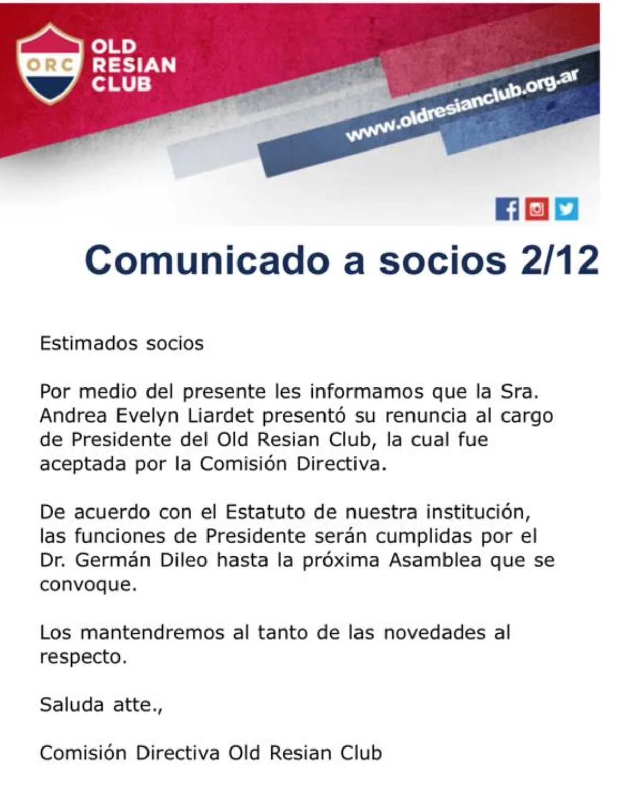 Tras el escándalo, el Club Old Resian no emitió un comunicado oficial, pero sí se dirigió a sus socios en un escrito que circuló por diferentes plataformas: «Recientemente, se detectaron movimientos irregulares en las finanzas del club, que no encuentran vinculación alguna con el flujo normal y el giro habitual de la Institución, lo cual motivó la realización de una auditoría interna inmediata. Asimismo, se están ejercitando y llevando a cabo todas aquellas medidas urgentes y necesarias en resguardo del patrimonio social, y el interés de la Institución».