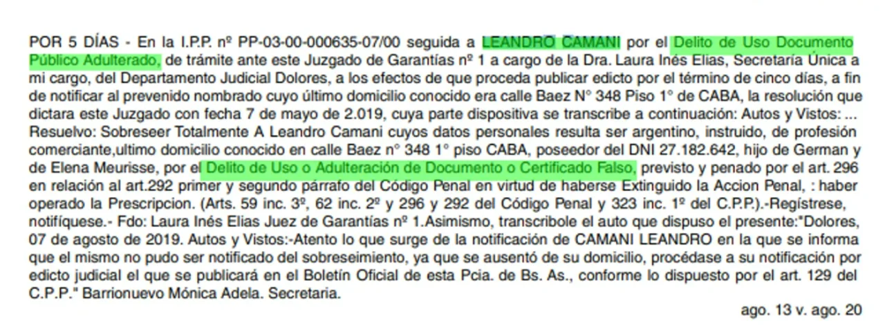 En este sentido, consideró que los denunciantes formales (Facundo del Gaiso y Matías Yofe) cumplieron “el rol de ejecutores instrumentales de la maniobra orquestada por Camani”. “La estructura fáctica descripta permite advertir un reparto de roles, en el cual Camani aparece como organizador y beneficiario económico, mientras que los denunciantes actúan como canal formal de activación del frente penal”, aseguró.