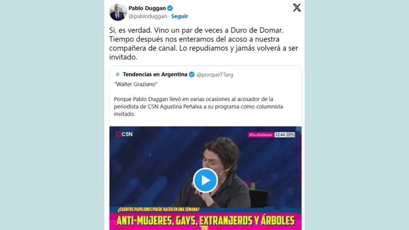 «Vino un par de veces a Duro de Domar. Tiempo después nos enteramos del acoso a nuestra compañera de canal. Lo repudiamos y jamás volverá a ser invitado», aseguró Duggan.