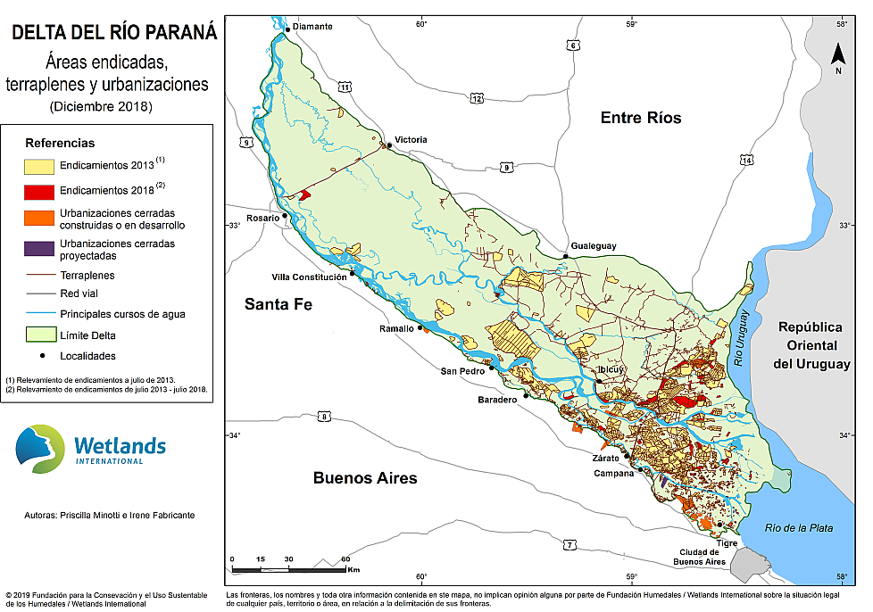 La Fundación Humedales/ Wetlands International y organizaciones ambientales argentinas publicaron su último mapeo de endicamientos en humedales del país que ponen en riesgo esos frágiles territorios al modificar los patrones de escurrimiento de aguas, capacidad de drenaje en las crecidas y otros fenómenos adversos. En el Delta del Paraná midieron un total de 19.386,08 kilómetros cuadrados encerrados por terraplenes (casi dos millones de hectáreas).
