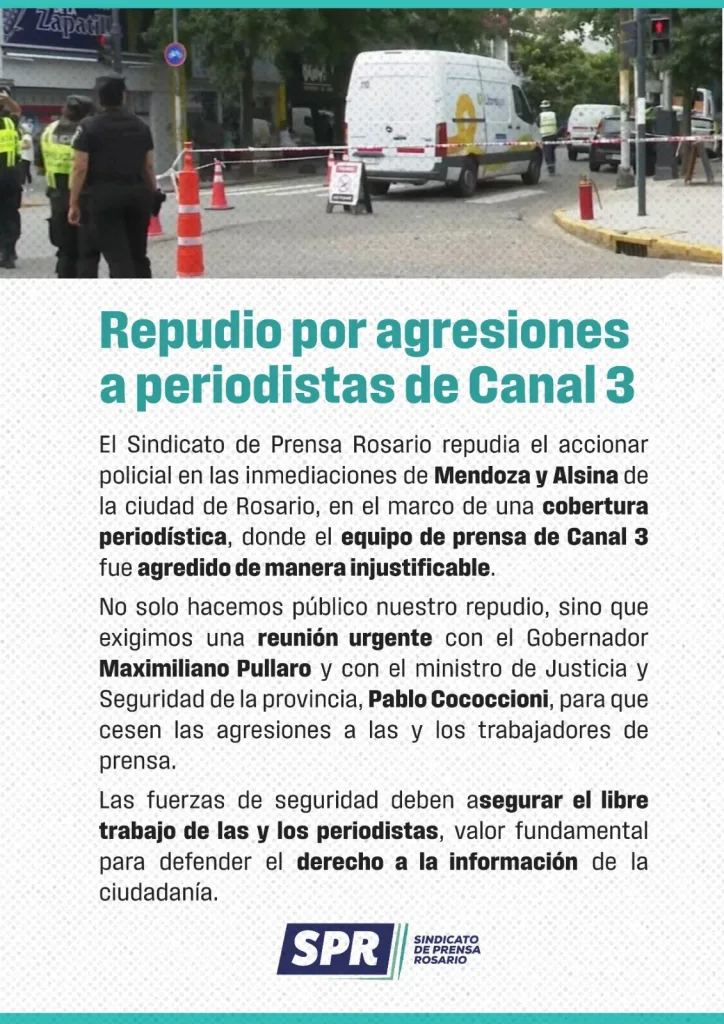 El sindicato de Prensa Rosario (SPR) hizo público un comunicado de repudio del accionar de las fuerzas de seguridad en el contexto de una cobertura periodística y solicitó una reunión “urgente” con el Gobernador Maximiliano Pullaro.
