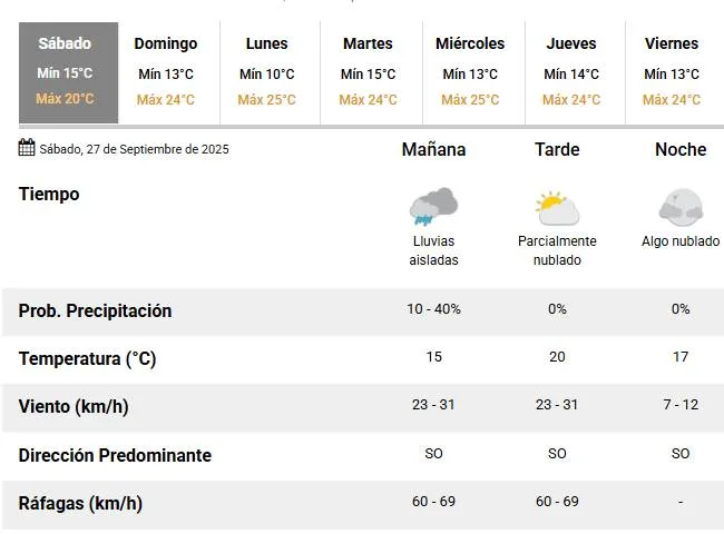 Sábado con lluvias aisladas en la mañana, luego el cielo estará algo nublado en la tarde y nublado en la noche. El Servicio Meteorológico Nacional (SMN) anunció para este 27 de septiembre una temperatura mínima de 15 °C y una máxima que rondará en los 20 °C.