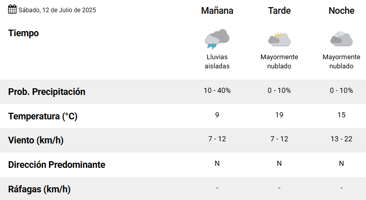 El pronóstico oficial anuncia un sábado con probabilidad (baja) de lluvias aisladas por la mañana y resto del día mayormente nublado. La máxima prevista es de 19 grados y los vientos soplarán del norte durante toda la jornada.