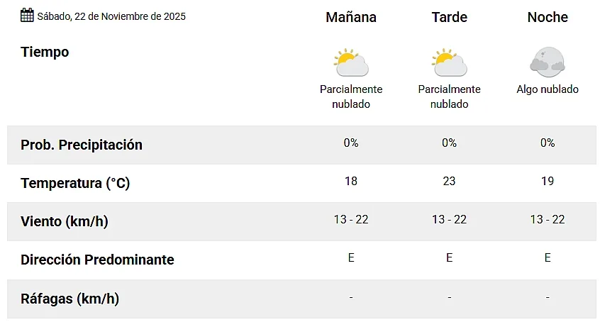 El pronóstico oficial anuncia un sábado con una máxima estimada de 23 grados. Y con cielo parcialmente nublado durante toda la jornada. Los vientos soplarán del Este.