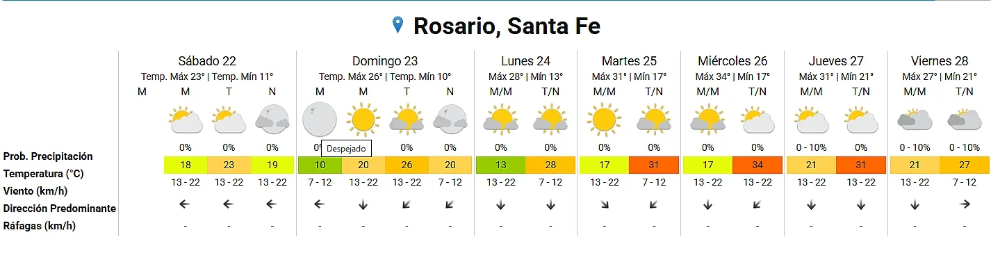 El martes, termómetro llegando a los 31, con vientos del Noroeste y Noreste. Miércoles ya se asoma con hasta 34 grados, y después leve descenso el jueves (31 grados) y el viernes (27).