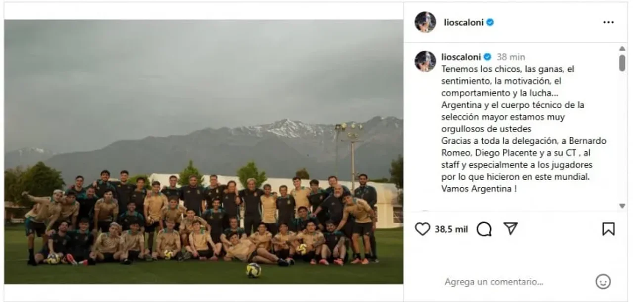 “Gracias a toda la delegación, a Bernardo Romeo, Diego Placente y a su cuerpo técnico, al staff y especialmente a los jugadores por lo que hicieron en este Mundial. ¡Vamos Argentina!” añadió quién, además de ser el entrenador de la Selección argentina campeona del mundo en Qatar 2022, conquistó el Mundial juvenil en 1997 en Malasia.