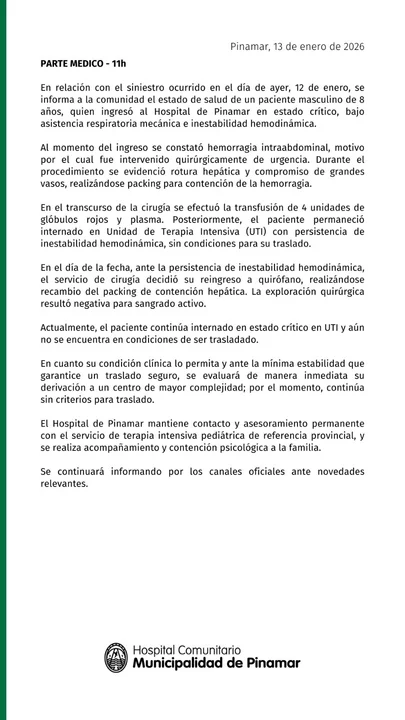 En esta ocasión, explicaron que se realizó el recambio del packing de contención hepática y que la exploración quirúrgica resultó negativa para sangrado activo. Actualmente, el paciente continúa internado en estado crítico en la UTI y aún no se encuentra en condiciones de ser trasladado.