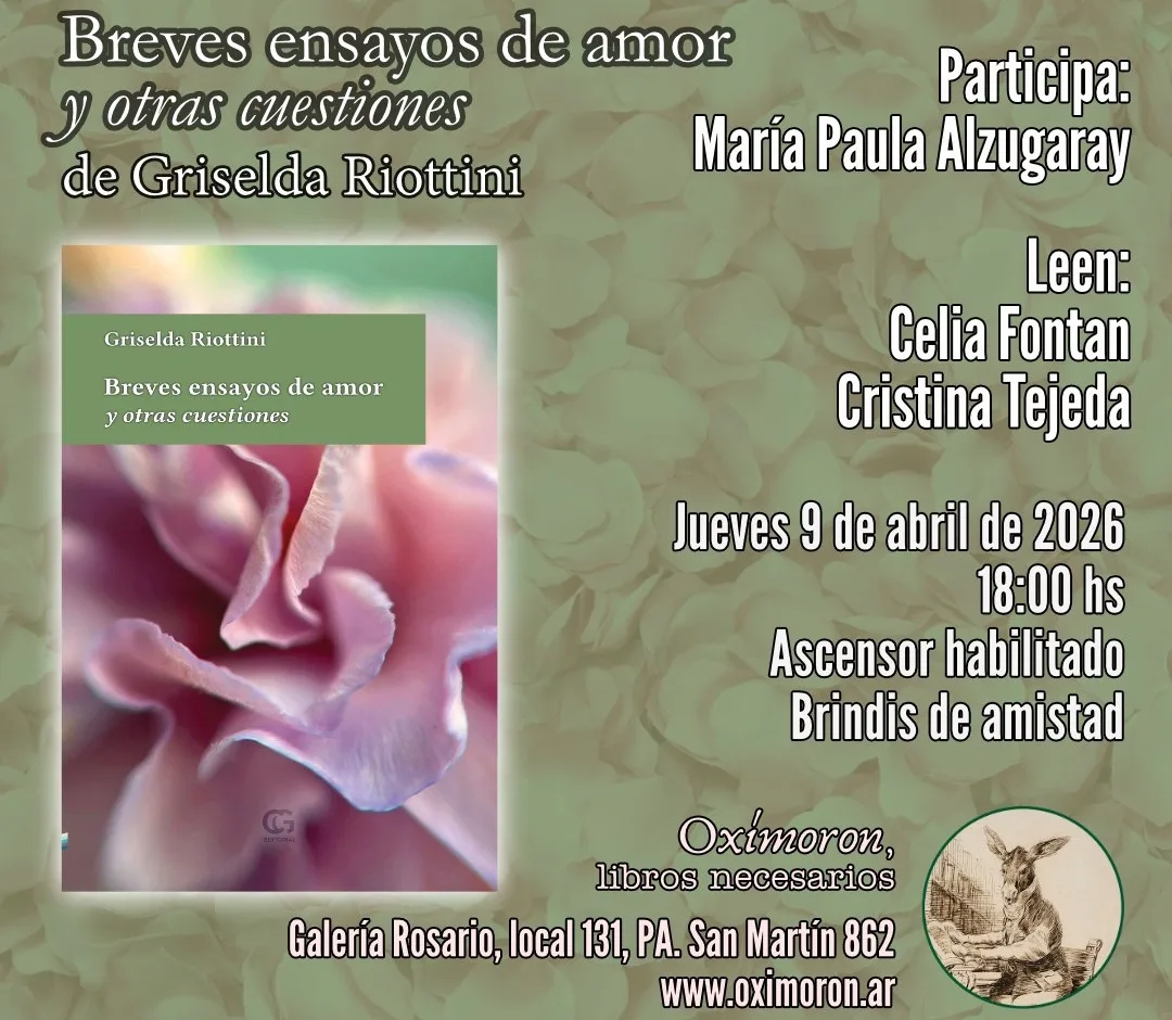 Este jueves 9 de abril, a las 18, en la librería Oxímoron (Galería Rosario, local 131, planta alta en San Martín 862), la poeta, traductora y docente rosarina Griselda Riottini presentará Breves ensayos de amor y otras cuestiones (Ciudad Gótica, 2025), su nuevo libro. En la ocasión acompañarán a la autora, la poeta y editora María Paula Alzugaray, y leerán pasajes del libro las también escritoras Celia Fontan y Cristina Tejeda.