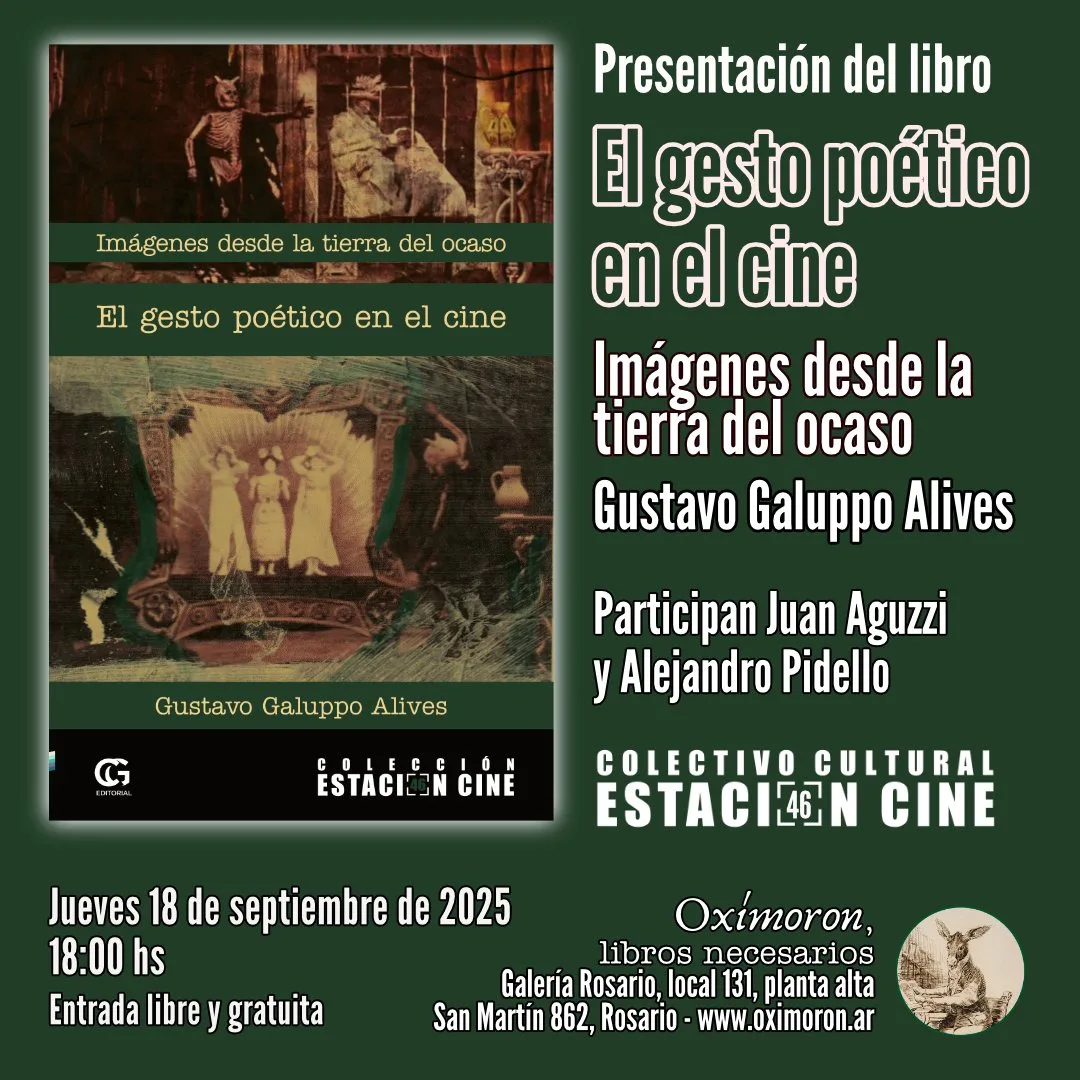 El jueves 18 de setiembre en la librería Oxímoron (San Martín 862, planta alta, local 131), a las 18, se presentará el libro El gesto poético en el cine. Imágenes desde la tierra del ocaso, del realizador, escritor y docente Gustavo Galuppo. Publicado por Ciudad Gótica Editorial y perteneciente a la colección Estación Cine, que coordina el también escritor Sergio Fuster, el libro está planteado como una suerte de ensayo literario sobre lo sagrado que pueden portar ciertas imágenes en el cine, sobre los rasgos poéticos que pueden detectarse y sobre la potencia que a partir de allí se despliega, con el objetivo de pensar otro mundo posible que se oponga a la “violencia insostenible del capitalismo”, sobre todo indagando en esas imágenes para encontrar su función de huella y de símbolo en el carácter arcaico que pervive en ellas.