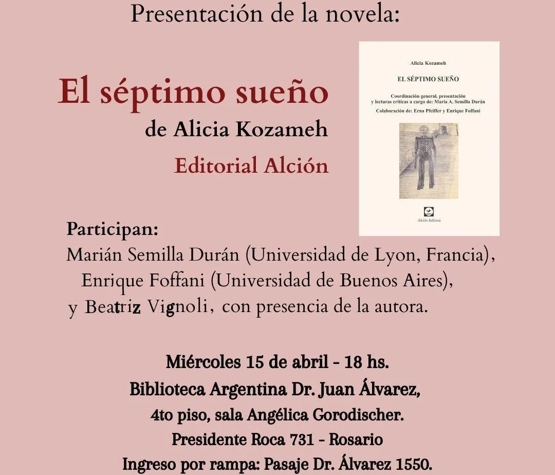El miércoles 15 de abril a las 18, en la sala Angélica Gorodischer del piso 4 de la Biblioteca Argentina (Roca 731, Rosario), la narradora y poeta rosarina radicada en Estados Unidos Alicia Kozameh presentará El séptimo sueño, su último libro de reciente edición nacional por Alción Editora (Córdoba), que viene publicando su obra. En la ocasión, acompañarán a la autora María Semilla Durán, académica de la Universidad de Lyon (Francia), quien tuvo a su cargo la iniciativa y la coordinación general de la edición y es autora de uno de los estudios preliminares que configuran la edición crítica de la obra; Enrique Foffani, autor de otro de aquellos estudios y Beatriz Vignoli, poeta y narradora rosarina premiada. El otro ensayo incluido en el libro es obra de Erna Pfeiffer, académica de la Universidad de Graz (Austria) y traductora al alemán de la obra de Kozameh.