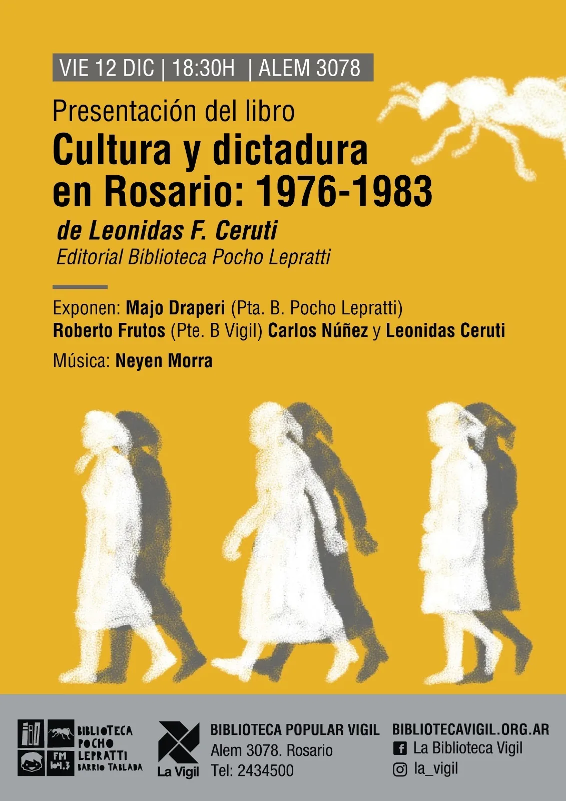 En el marco del Día Internacional de los Derechos Humanos y la recuperación de la democracia y camino a los 50 años del último golpe de Estado en Argentina, las bibliotecas Populares Vigil y Pocho Lepratti invitan a la presentación de la segunda edición del libro “Cultura y Dictadura en Rosario (1976-1983)” de Leónidas Noni Ceruti.