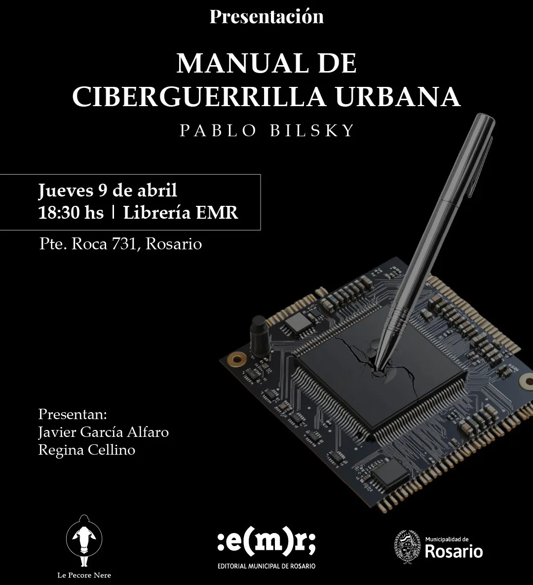 Este jueves 9 de abril, a las 18.30, en la librería EMR (Editorial Municipal de Rosario, Pte. Roca 731), tendrá su presentación Manual de ciberguerrilla urbana (Le Pécore Nere, 2026), reciente libro del periodista, escritor y docente Pablo Bilsky, con la participación del periodista y escritor Javier García Alfaro y la editora y escritora Regina Cellino.