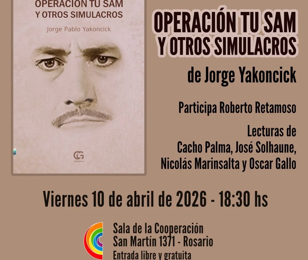 El viernes 10 de abril, a las 18.30, en la Sala de la Cooperación (San Martín 1371), se presentará Operación Tu Sam y otros simulacros (Ciudad Gótica, 2026), del escritor rosarino Jorge Yakoncick. El autor estará acompañado por el crítico, investigador y escritor Roberto Retamoso. De las lecturas que tendrán lugar durante el evento, se encargarán Cacho Palma, José Solhaune, Nicolás Marinsalta y Oscar Gallo.