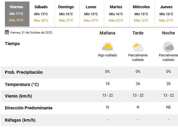 Viernes con temperaturas agradables para este último día del mes de octubre. El Servicio Meteorológico Nacional (SMN) anunció para este viernes 31 una temperatura mínima de 11°C y una máxima que rondará en los 26 °C.