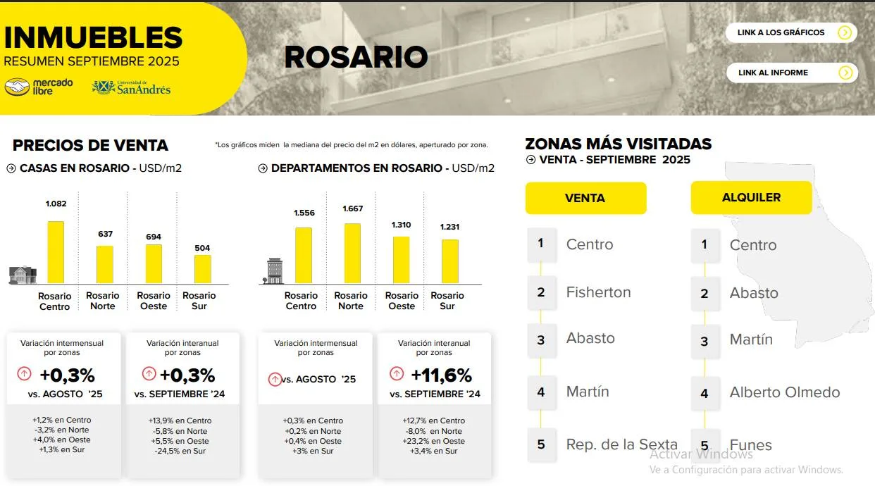 El informe señala que en septiembre de 2025, en la ciudad de Rosario, se registran variaciones intermensuales (relativas a agosto de 2025) del precio de venta en dólares por m2 de casas (0.3%), departamentos (0.4%) y de oficinas (0.0%).