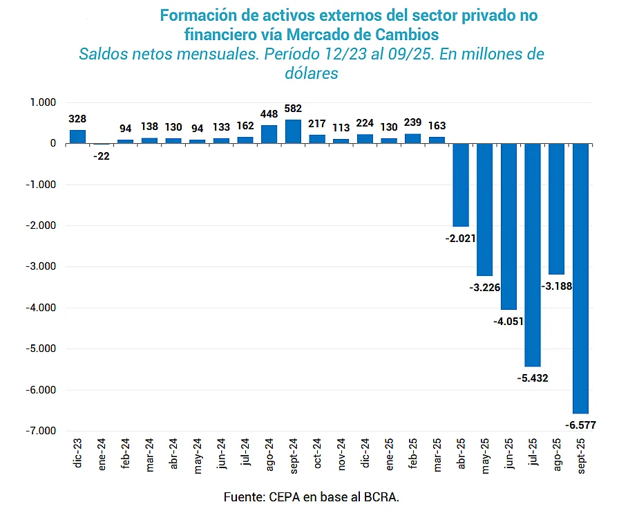 La fuga de divisas del sistema financiero, formalmente denominada «formación de activos externos», cerró el noveno mes de 2025 en máximos históricos. Fueron 6.577 millones de dólares, el monto más elevado desde la existencia del Mercado Único Libre de Cambios (MULC). La cifra supera los 5.946 millones demandados en agosto 2019, el anterior récord. Y es un 110% mayor al drenaje de agosto previo.