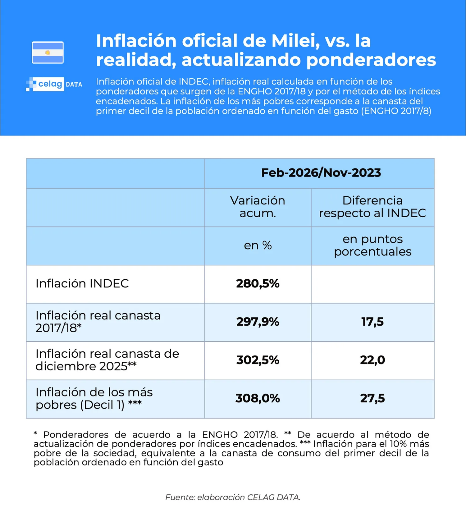 Con las actualizaciones metodológicas señaladas, si bien la inflación oficial del Indec durante la gestión de La Libertad Avanza arroja 280,5%, la inflación que surge de actualizar la metodología con la encuesta 2017/18 da 297,9%, 17,5 puntos porcentuales mayor a la oficial. Y si se actualiza con los ponderadores a diciembre de 2025, el resultado es 302,5%. Esto es, 22 puntos porcentuales mayor.