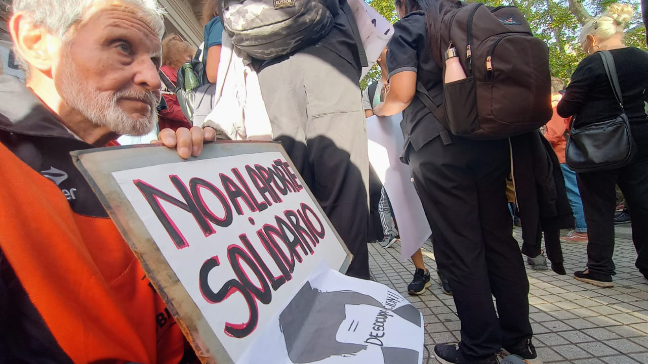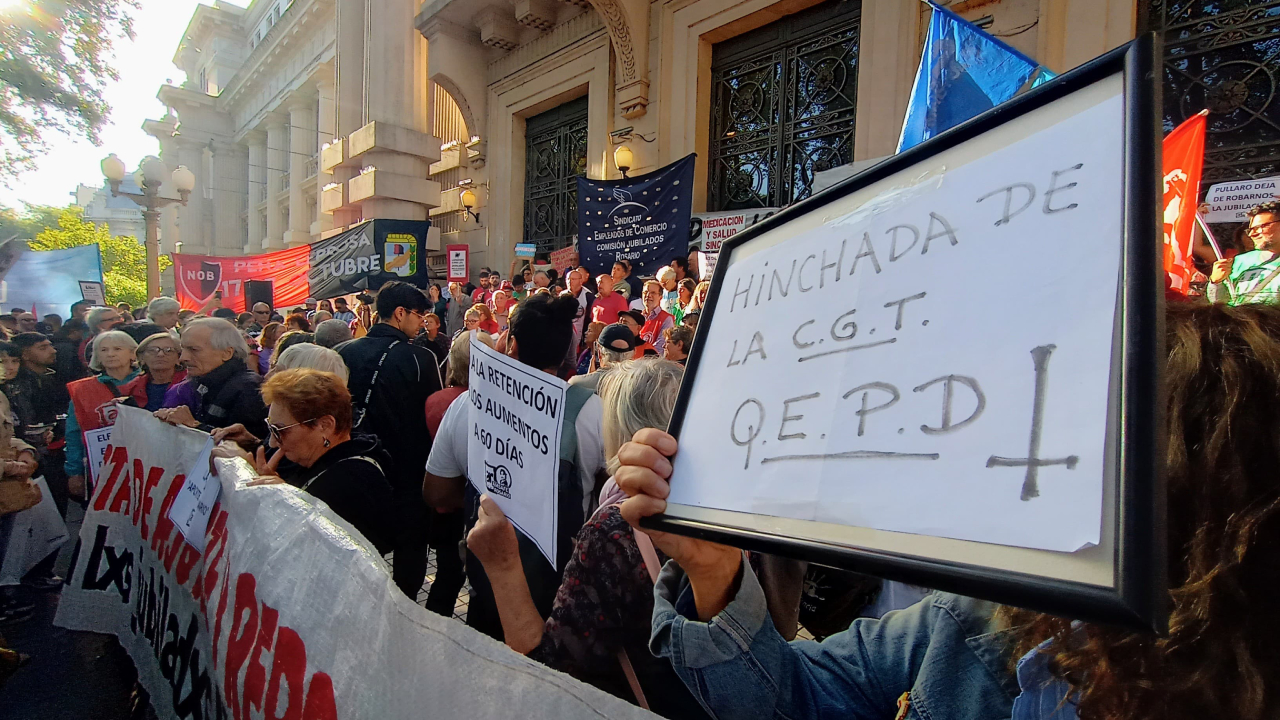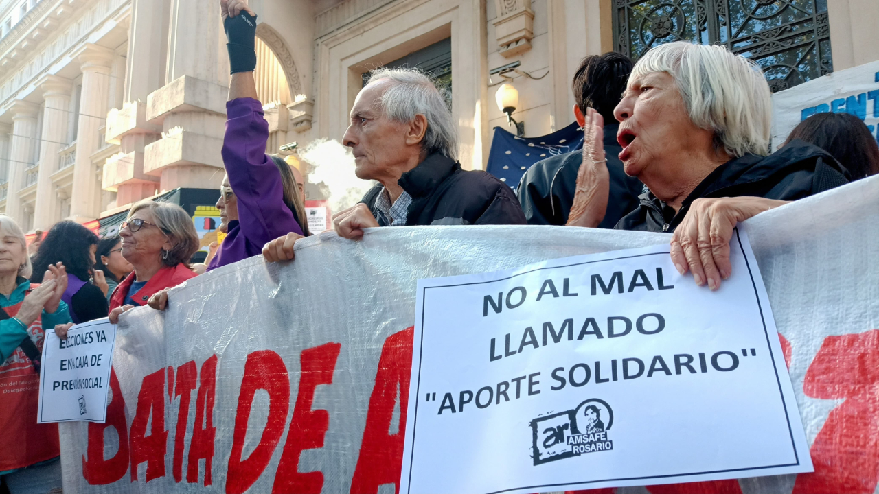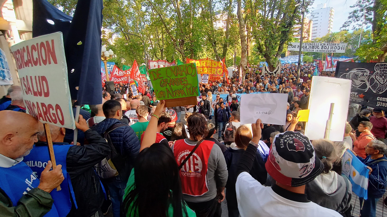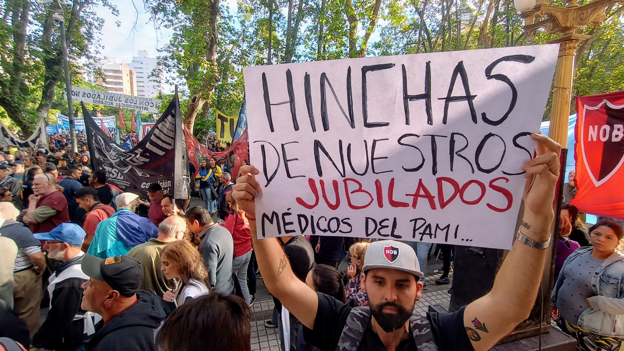 El Frente de Jubilados en Lucha, la Intersindical Rosario, que componen gremios enrolados en la CGT y la CTA de los Trabajadores, junto a otras agrupaciones e hinchas de fútbol marcharon a la plaza San Martín con un racimo de consignas, pero la primera y urgente es: “Basta de pegarle a los viejos”.