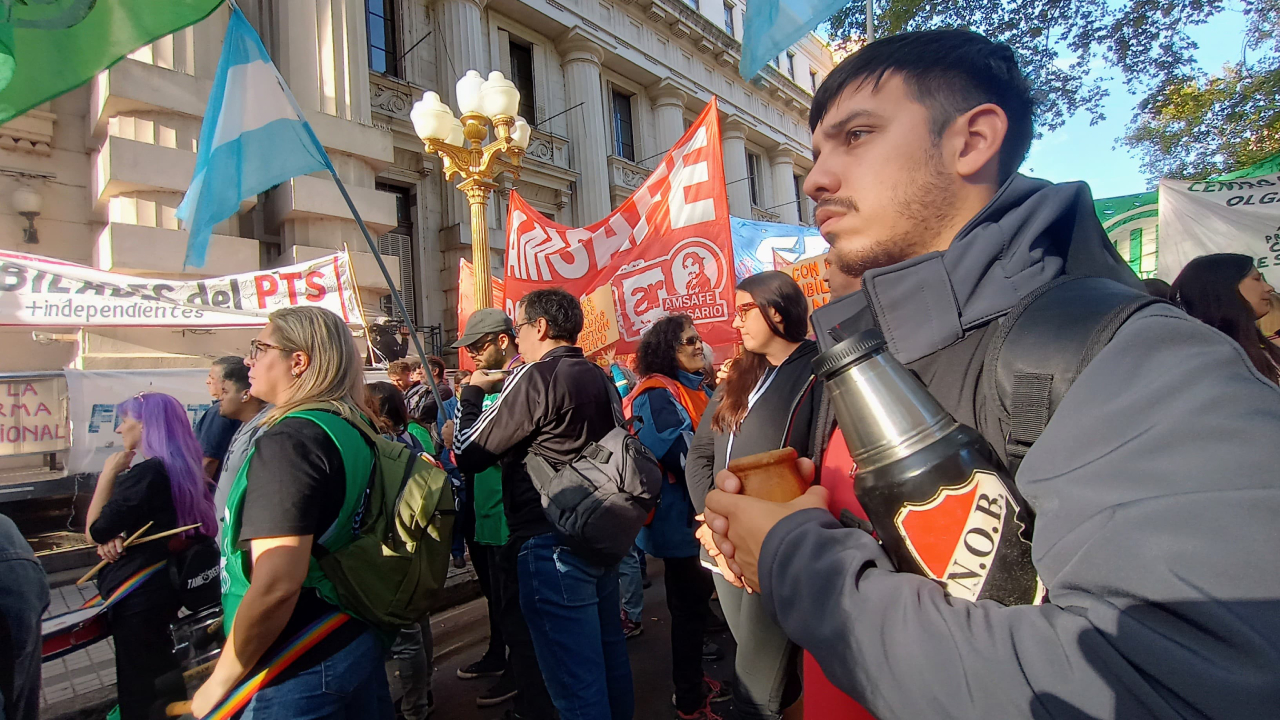 En la plaza ya estaban apostados, frente a la sede de Gobierno de la provincia, Amsafé Rosario junto a Coad, el gremio de docentes universitarios, ATE Rosario y movimientos sociales como la Corriente Clasista y Combativa, el Polo Obrero y fuerzas políticas de izquierda. Una agrupación leprosa, 17 de Octubre, vinculado al Movimiento Evita, había colgado una gran bandera de colores rojo y negro, con un escudo justicialista en un extremo. En rigor, prácticamente toda la plaza estaba salpicada de casacas de Newell’s y Central, y se denotaban también las camisetas de Central Córdoba, con todas las parcialidades también dentro de las columnas de las distintas organizaciones, muestra de que la convocatoria había calado en las tribunas de fútbol. Y cerca de las 18 seguían llegando personas en forma suelta o en grupos, sumándose a distintas agrupaciones o acompañando por las suyas la movida. Una hora después, poco antes de las 19, tras escuchar a los oradores de las organizaciones de jubilados, la Intersindical Rosario emprendió la partida sin que ninguno de los dirigentes tomara el micrófono. Sí lo hicieron otras organizaciones y fuerzas políticas dando lugar a una larga lista de dirigentes que hacían uso de la palabra en el ocaso de la tarde y del acto.