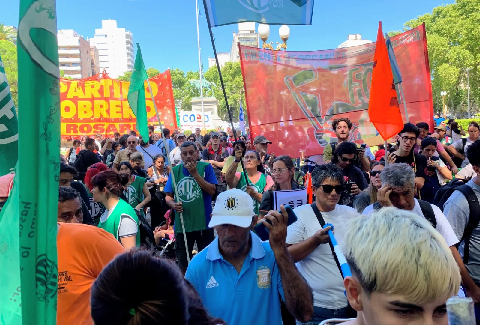 La concentración rosarina fue en la plaza San Martín, frente a la sede de la Gobernación, y arrancó alrededor de las 11. Diferentes sindicatos, en paralelo, enviaron una delegación a la ciudad de Buenos Aires para sumarse a la movida frente al Congreso nacional.