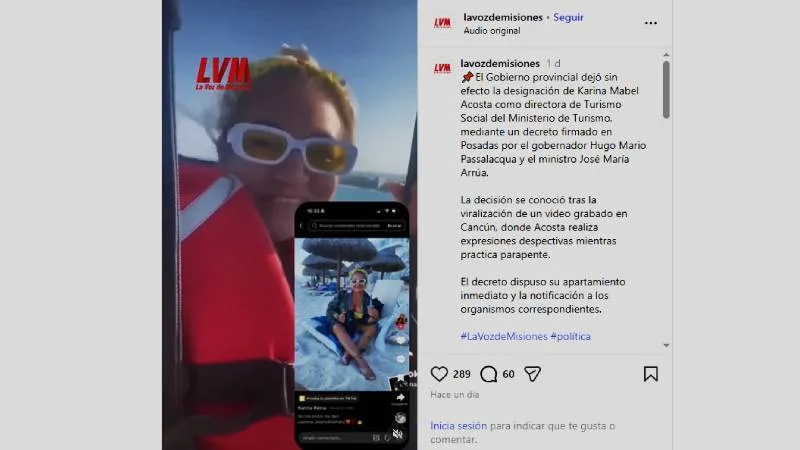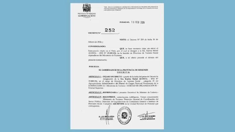 El final llegó luego de que el escándalo llegó a las redes con múltiples comentarios de los misioneros. El gobierno decidió apartarla de su cargo, según informó el medio local La Voz de Misiones “el Gobierno de la provincia dejó sin efecto la designación de Karina Mabel Acosta como Directora de Turismo Social del Ministerio de Turismo” mediante el Decreto N° 252, firmado en Posadas el 18 de febrero de 2026. A partir de la fecha se deja sin efecto el nombramiento.
