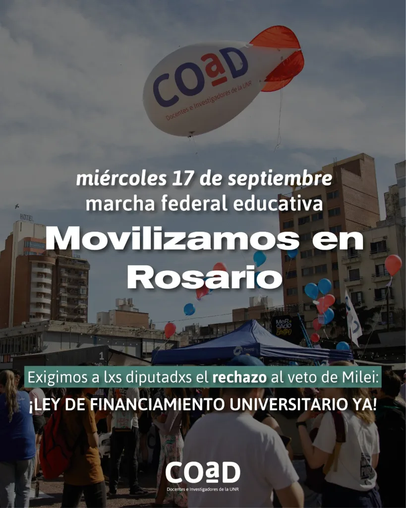 “Necesitamos organizarnos y resistir al veto del gobierno es por eso que lxs docentes de la UNR nos convocamos en asamblea este lunes 15 de septiembre a las 18 horas en el aula 18er de la Facultad de Humanidades y Artes”.