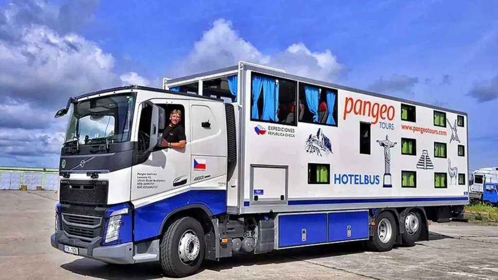 Pertenece a Pangeo Tours, una empresa checa que tiene tres de estos Hotelbuses recorriendo Europa, África y América. La que viaja por América del Sur y Central, es el autobús de hotel tipo FM9/15 para 15 personas, en este caso, todos los tripulantes son de República Checa.