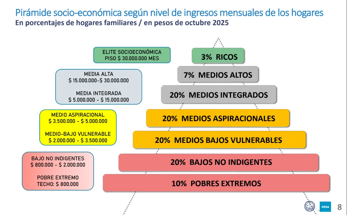 La pirámide, además del concentrado sector «rico», muestra añmargen de los infortunios a un 20% de la población argentina que denomina «media integrada», y a un 7% dentro de lo que llama «media alta».