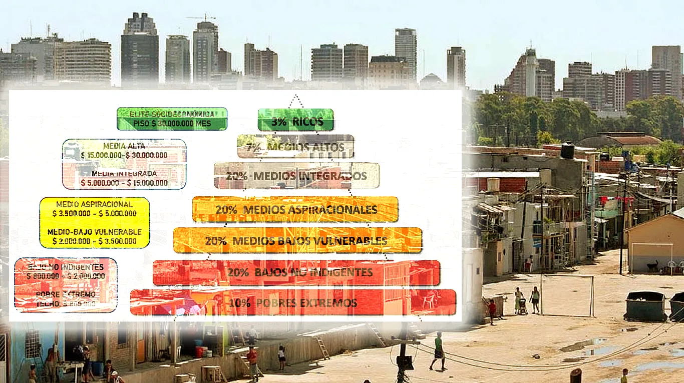 Hoy, por niveles de ingreso de los hogares y en base a datos del Indec, el relevamiento indica que solo el 3% de las familias entran en la categoría de ricas. En la base de la pirámide socio económica, apenas sobrevive el 10% atrapado en la pobreza extrema.
