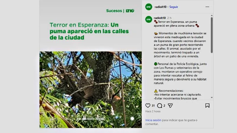 Los vecinos de la localidad de Esperanza se llevaron una gran sorpresa al notar la presencia de un puma en plena calle. Aparentemente, el animal fue perseguido por perros que lo obligaron a trepar a un árbol, donde aún permanece. La zona del hallazgo se encuentra a una cuadra de la ruta, por lo que se sospechan que llegó desde los campos, según publicó la radio LT10.