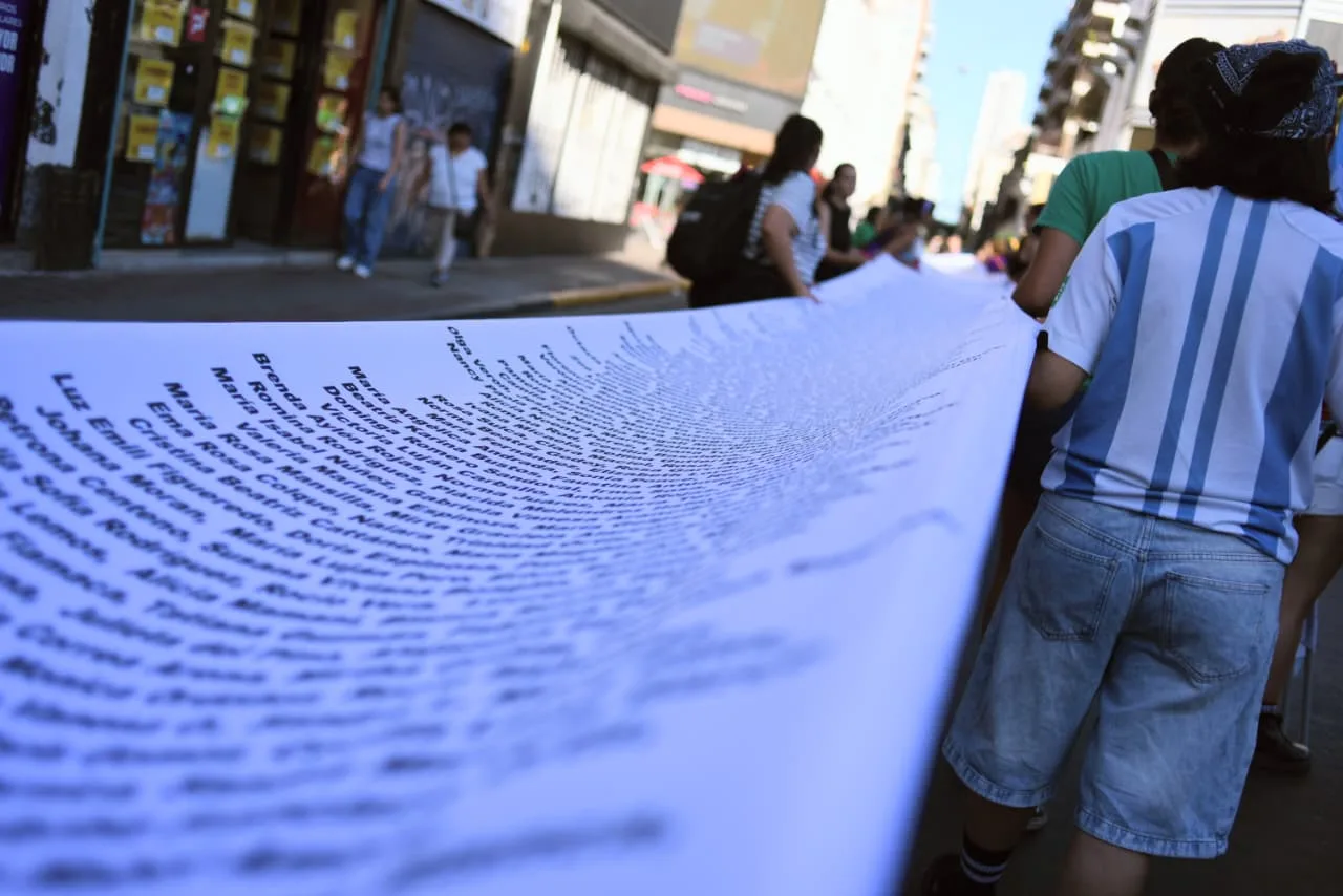 Las manos de cientos de mujeres sujetaron una bandera blanca con 3 mil nombres de víctimas de femicidios. «Marchamos en un contexto de negación del femicidio: matan a una mujer cada 34 horas en nuestro país», sostuvieron desde la organización.
