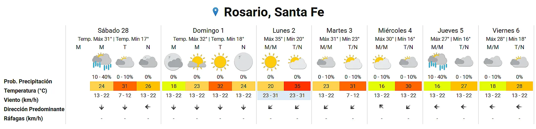 El martes asoma menos agobiante, con una máxima calculada de 32 grados y parcialmente nublado. Para el jueves se anticipa probabilidad de lluvia por la mañana con descenso de temperatura (hasta los 27 grados). Y la estimación para el viernes es de cielo nublado y una máxima de 28 grados.