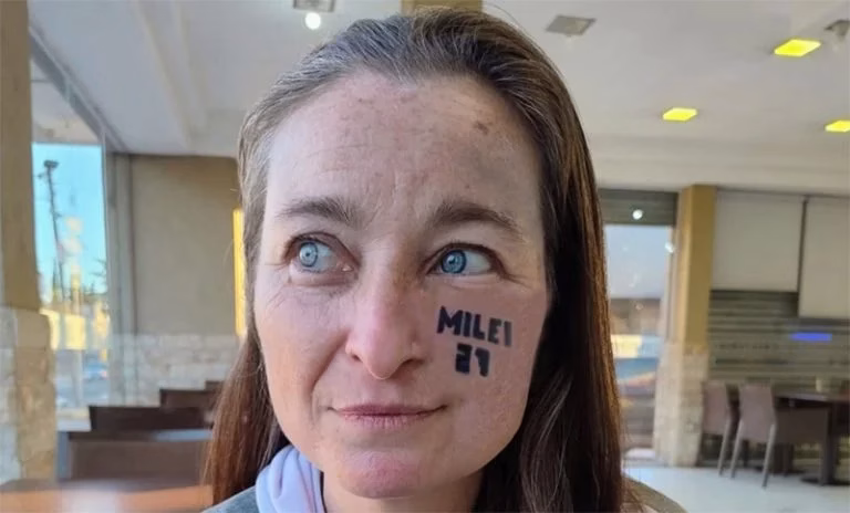 “No + pirotecnia” o “Castrate”, eran algunas de las consignas animalistas que decidió dejar en el pasado para tatuarse simplemente “Milei 27” en el rostro, augurando una victoria del actual presidente en los comicios que determinarían su reelección.