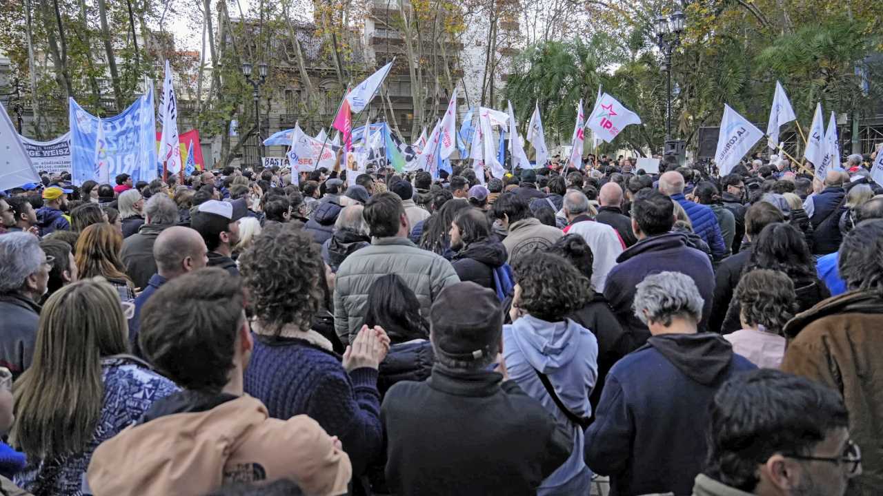 “Estamos acá porque entendemos que esto está siendo un atropello a la democracia y a las garantías constitucionales. Todos vimos realmente el mamarracho jurídico que fue el juicio a Cristina Fernández”, señalaron los referentes nucleados en la Intersindical Rosario.