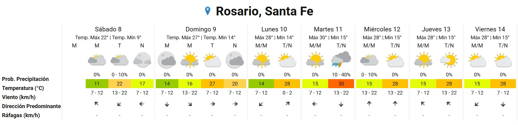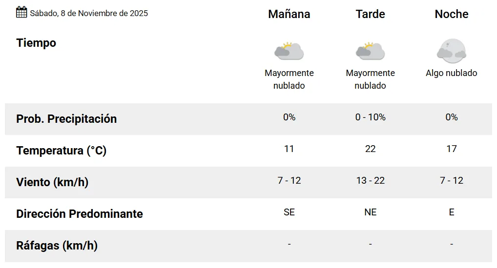 Para el domingo, la previsión es similar. Mínima de 11 grados, máxima de 22. Y vientos tenues del Norte, Noroeste y Oeste.