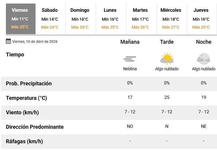 Viernes con buen tiempo en Rosario. El Servicio Meteorológico Nacional (SMN) anunció para este 10 de abril una temperatura mínima de 11°C y una máxima que rondará en los 25 °C.