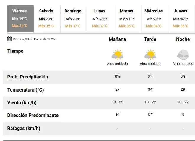 El Servicio Meteorológico Nacional (SMN) anunció para este 23 de enero una temperatura mínima de 19 °C y una máxima que rondará en los 34 °C