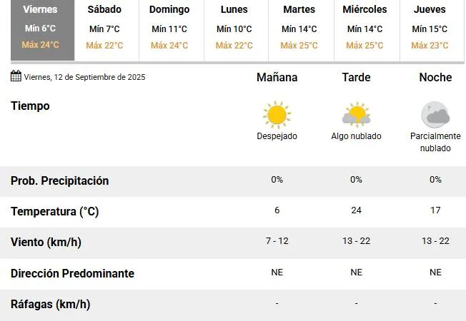 Buen tiempo para este viernes en Rosario. El Servicio Meteorológico Nacional (SMN) anunció para este 12 de septiembre una temperatura mínima de 6 °C y una máxima que rondará en los 26 °C.