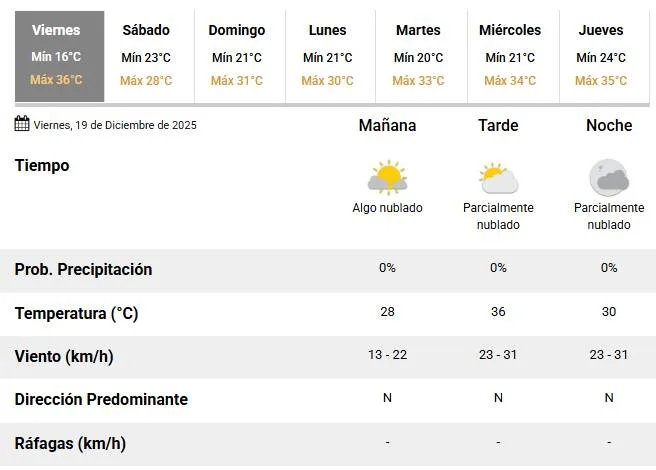 Viernes con mucho calor con la ciudad. El Servicio Meteorológico Nacional (SMN) anunció para este 19 de diciembre una temperatura mínima de 16 °C y una máxima que 36 °C.