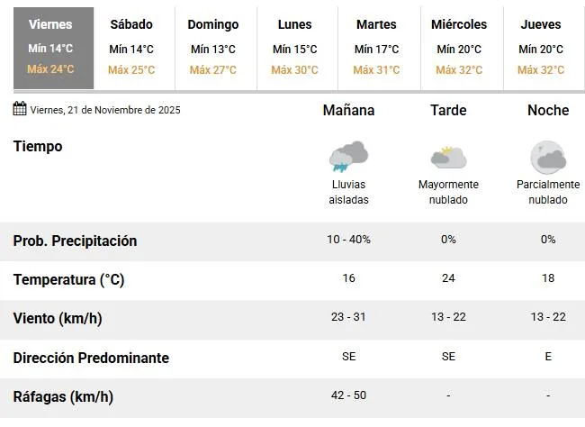 El Servicio Meteorológico Nacional (SMN) anunció para este 21 de noviembre una temperatura mínima de 14 °C y una máxima que rondará en los 24 °C. Vientos del sureste con ráfagas de entre 43 y 50 kilómetros por hora. Por la tarde ya vientos en calma del mismo sector y en la noche rotarán dirección este.